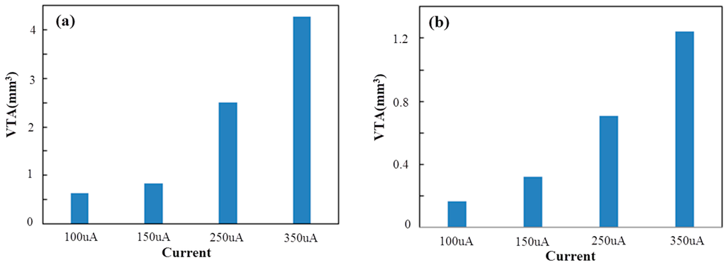 The aim of this FEM simulation was to demonstrate the efficient spread of electrical stimulation in STN generated by DBS [57]. The extracellular potential (V) distributions in STN during monopole stimulation on double-side site #0 were studied. The extracellular potential (V) distributions generated from monopole stimulation at different current intensities in STN are shown in Figure 8 and Figure 9. Figure 8 shows the one-dimensional distributions of the extracellular potential (V) in three directions at various stimulus intensities. Figure 9 shows the three-dimensional extracellular potential distribution isosurface of −0.5 V (the extracellular excitation threshold) generated by DBS at different currents. When applying current intensities of 100, 150, 250 and 350 μA, the voltage values at the surface of electrode site #0 were 2.3096, 3.4644, 5.7739 and 8.0835 V, respectively. The potential distribution increased as the current stimulus was increased. In order to qualify the effects of the stimulation, VTA was calculated as the vital standard to measure the stimulus effects [58]. As shown in Figure 10a, when applying current intensities of 100, 150, 250 and 350 μA to STN, the VTA values were 0.6321, 0.8346, 2.5067 and 4.2805 mm3, which indicated that the VTA values increased with the stimulation intensities. Furthermore, we compared the stimulus effects of double-side monopole stimulation with that of single-side monopole stimulation. For single-side monopole stimulation, when applying current intensities of 100, 150, 250 and 350 μA, the VTA values were 0.1669, 0.3233, 0.7055 and 1.2404 mm3 (Figure 10b), showing that the VTA value of single-side monopole stimulation was significantly lower than that of double-side monopole stimulation (Figure 10a) when applying the same current intensity.