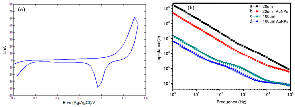 The stimulating and recording sites were further electrochemically characterized by electrochemical impedance spectroscopy (EIS) to measure the electrode impedances in 0.1 M PBS using electrochemical analyzer and the results were presented in Figure 11b. For a typical recording site with diameter of 20 μm (curve a of Figure 11b) , the average measured impedance was about 4.1 MΩ at 1 kHz and the average impedance was reduced to about 0.9 MΩ after electrodeposition of AuNPs (curve b of Figure 11b), which was in rough agreement with previously published results [35,37]. The average impedance of a typical stimulating site with diameter of 100 μm reduced from about 200 KΩ (curve a of Figure 11c) to about 80 KΩ (curve a of Figure 11c) after AuNPs were deposited on its surface. These results implied that AuNPs could greatly increase electron transfer rates and surface roughness of electrode site, reduce interfacial impedances and enhance the performance of stimulating/recording sites.