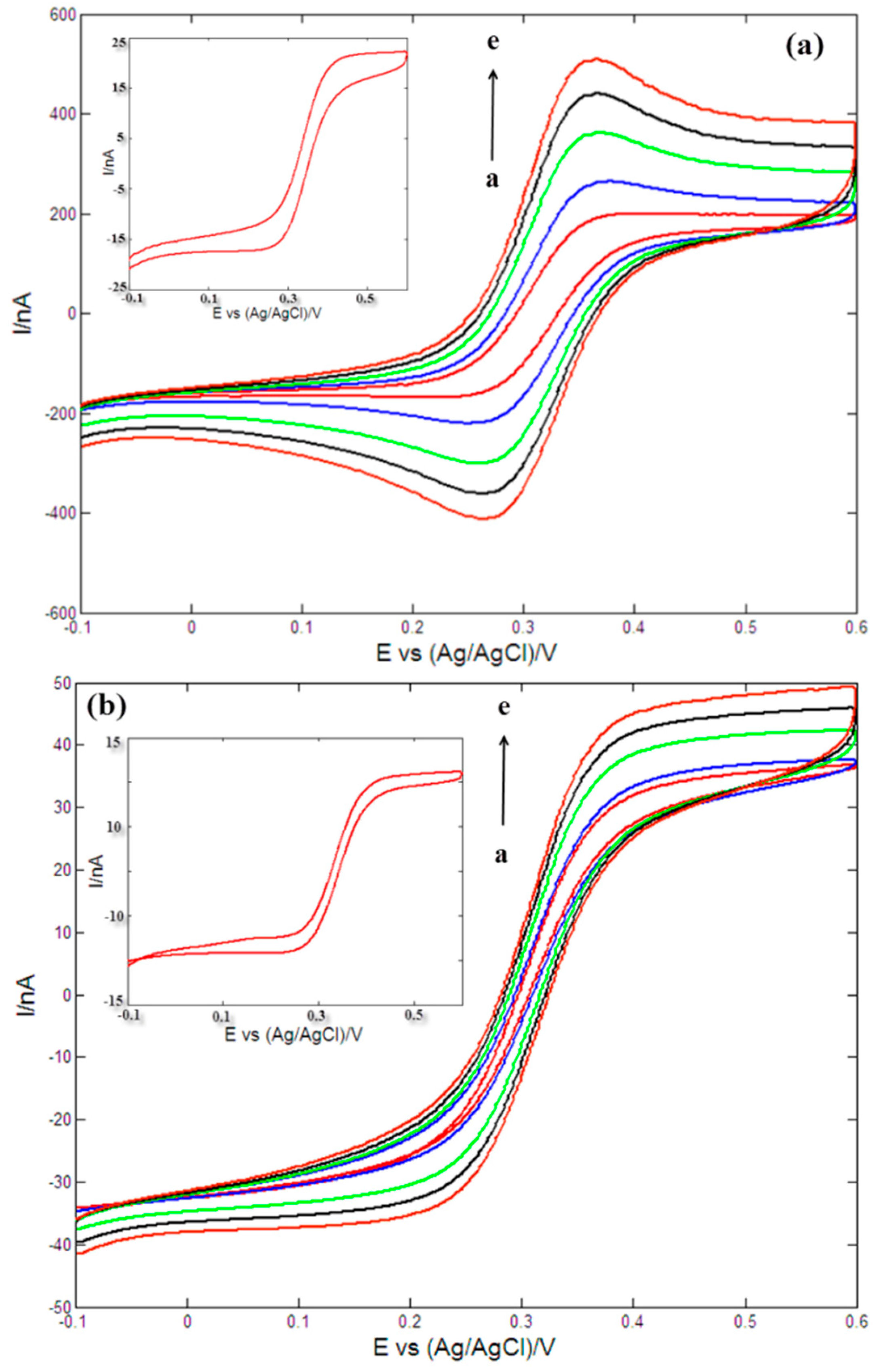 Cyclic voltammograms of the stimulating site modified with AuNPs (a) and recording site modified with AuNPs (b) in 0.1 M KCl solution containing 2 mM [Fe(CN)6]3−/4−. Scan rate: 20, 50, 100, 150 and 200 mV/s (from a to e). Inset of Figure 12a: cyclic voltammogram of bare stimulating site in 2 mM [Fe(CN)6]3−/4− at scan rate of 100 mV/s. Inset of Figure 12b: cyclic voltammogram of bare recording site in 2 mM [Fe(CN)6]3−/4− at scan rate of 100 mV/s.