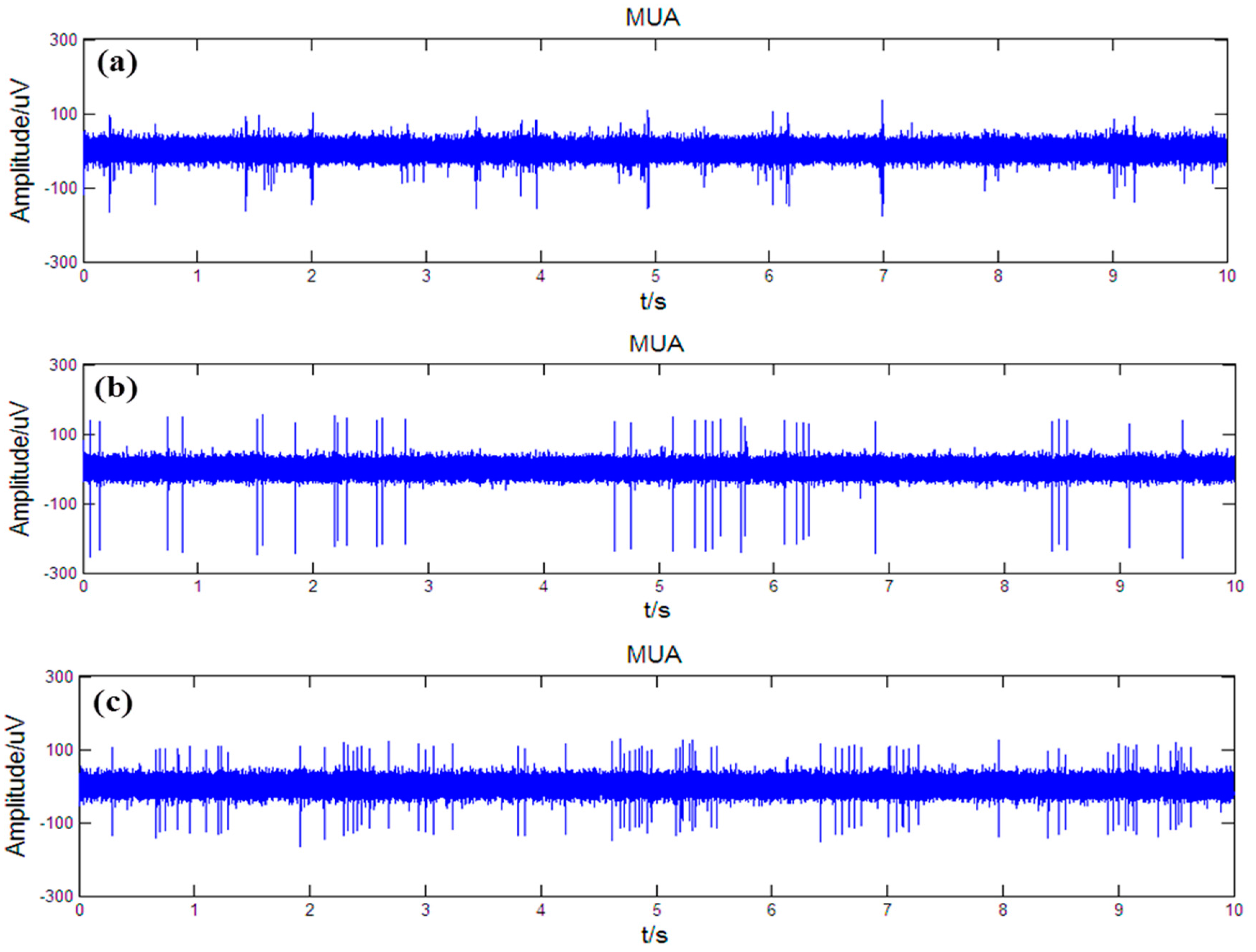 Simultaneously recorded MUA from striatum (a); GPi (b) and STN (c).