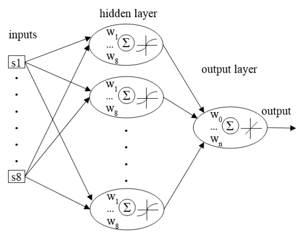 The architecture of the net consisted of eight inputs, one hidden layer with n-neurons and 1 output neurons. The number of hidden neurons n was determined according to a general suggestion [47], in which the number of hidden neurons should be less than 2N + 1 and where N is the number of inputs (the number of sensors in the present case). The architecture (Figure 1) of the net was determined in order to maximize the generalization ability of a net at its minimal complexity.