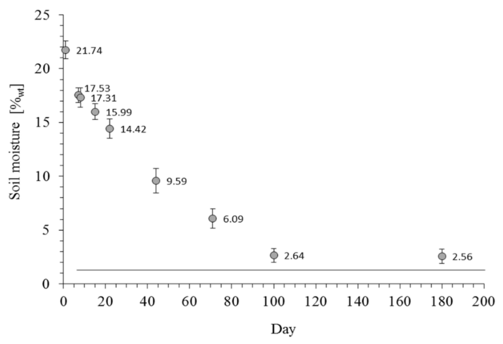 Changes in average moisture for all soils are presented in Figure 2. For all samples, the moisture was stabilized after the 100th day of the experiment, when it practically reached the AD soil moisture.