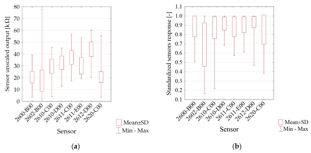 The similar course of the moisture vs. time curves for soils is due to similar initial moistures and drying conditions. Figure 3 presents the basic statistics of the sensor matrix read-outs in the form of a box-and-whisker plot. The ordinates’ axis shows the value of the signals from the particular sensors for all soils samples regarding the phase of the matrix flushed with air. The highest variability was noticed for the 2602-B00 sensor, applied for general air contaminants (with a high sensitivity to VOC and odorous gases), and 2620-C00, applied for alcohol and solvent vapours.