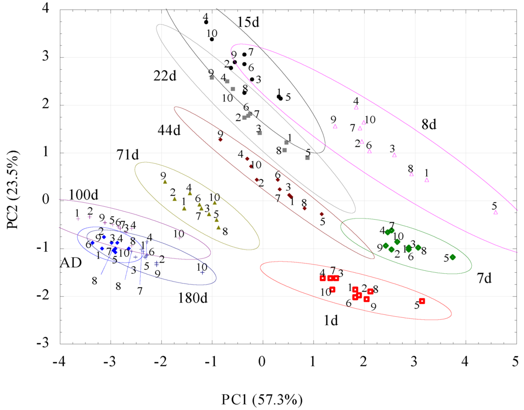 Two-dimensional PCA plots for volatile fingerprints for the 10 studied soils at 10 moistures. The same colours abbreviate the same moistures (AD state, d is days after moistening). The numbers abbreviate soils according to Table 1. The ellipses surround 95% confidence intervals.