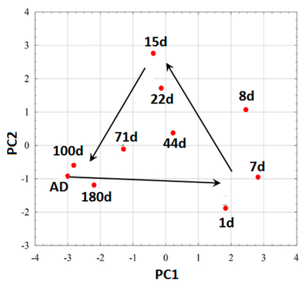 The most clustered results of the first measurement, (AD soils in Figure 3), indicate that the storage of a soil in AD conditions somehow equalizes the influence of the soil origin (type) on the volatile fingerprint. The microbial activity of AD soil is practically zero; however, the microorganisms can still be reactivated [50].