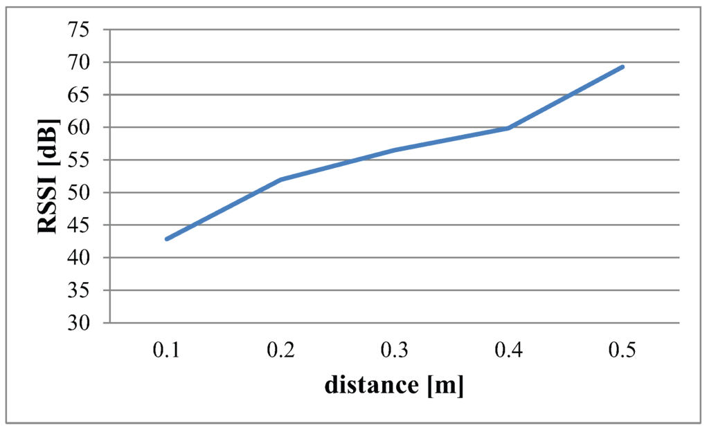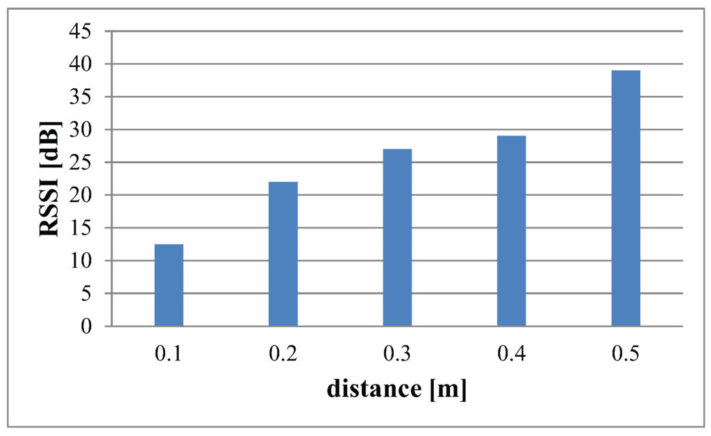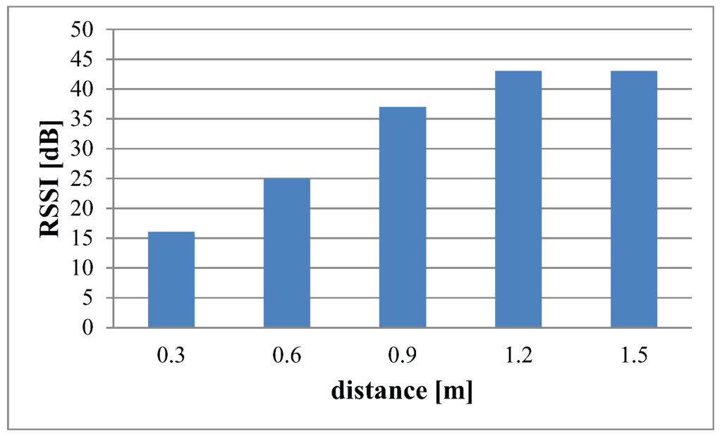 The blue graph depicts the averaged RSSI from 0.3 m to 1.5 m. From the above Equation (9), we get the value for slope of the line . Therefore, from the relation stated in Section 3.1, we calculate the value for path loss exponent . This verifies the path loss exponent for a terrestrial indoor environment as mentioned in Table 2. Figure 3 is the bar graph illustrating the RSS measured at each distance.