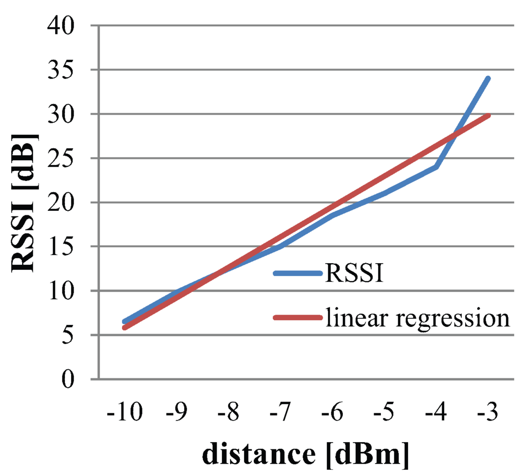 These results are obtained from RSS at different distances in an indoor environment. Figure 3 illustrates the overall path loss plotted from the RSS data collected in terrestrial indoor environments. With the help of a curve fitting tool in MATLAB, the best possible approximation of linear regression is calculated. Mathematically, this linear approximation is given as:
