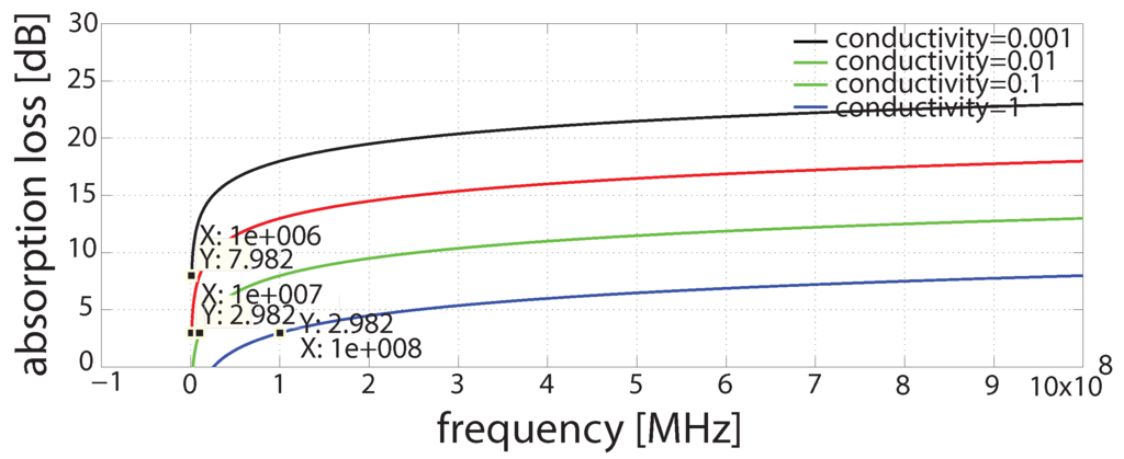 Thus, for absorption losses to be less than 3 dBs at water conductivity of 0.001 S, the radios ranging from Hz or greater can be used. Similarly, for absorption losses to be less than 3 dB at water conductivity of 0.01 S, the radios ranging from Hz or greater can be used. In addition, for absorption losses less to be than 3 dB at water conductivity of 0.001 S, the radio ranging from Hz or greater can be used.