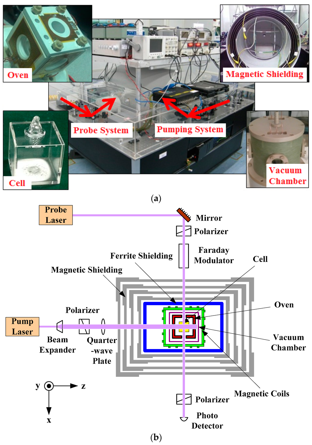 Arrangement of the SERF atomic spin magnetometer. (a) The photograph of the experimental device; (b) The schematic diagram of the light path. The pump beam propagates along the z direction. The probe beam is perpendicular to the pump beam and propagates along the x direction. The ferrite shielding is used to reduce the magnetic noise.