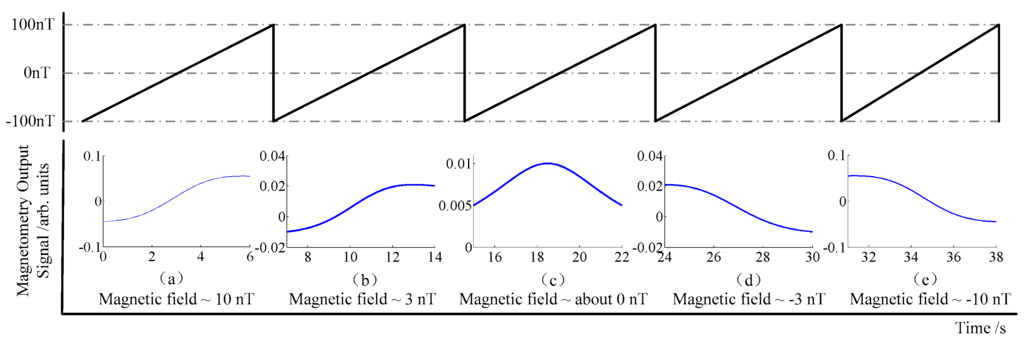 - During the simulation process, the residual magnetic field in the x direction is assumed as 10 nT, as shown in Figure 3a. A changing magnetic field from −100 nT to 100 nT is scanning in the z direction, meanwhile, the offset of the magnetic field in the x direction needs to be adjusted synchronously. By observing the output signal, it can be known that if the residual magnetic field in the shielding is counteracted gradually, the output signal will reduce, as shown in Figure 3b; otherwise, the output signal will increase. Continue to adjust the offset of the magnetic field in the x direction until the output signal reaches the minimum value, as shown in Figure 3c. After passing through this minimum value, the pattern of the output signal overturns, presently, the signal’s amplitude increases gradually, as shown in Figure 3d,e, respectively. The minimum value of the output signal is considered as the compensation point in the x direction.