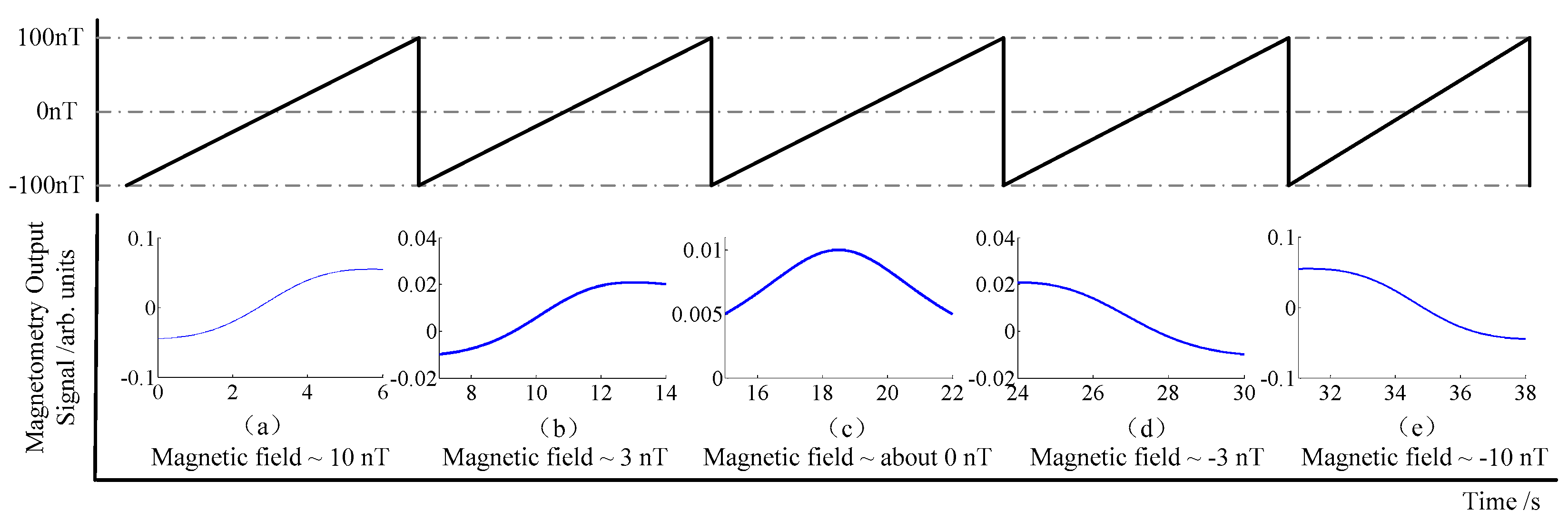 Simulation of the magnetic field compensation process. The magnetic field is changing from −100 nT to 100 nT by scanning the sawtooth wave.