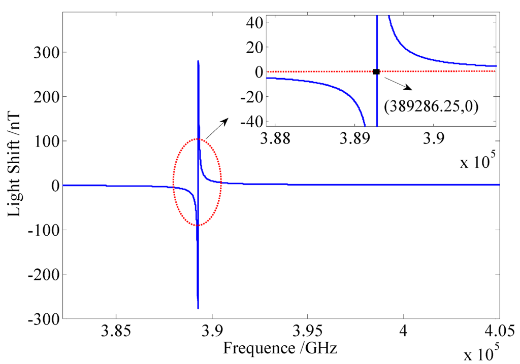 Figure 4 shows that the simulation of the relation between the light shift and the frequency of the pump beam. With changing frequency, the light shift can pass through a zero point, which is at the resonant peak of 389,286.25 GHz.