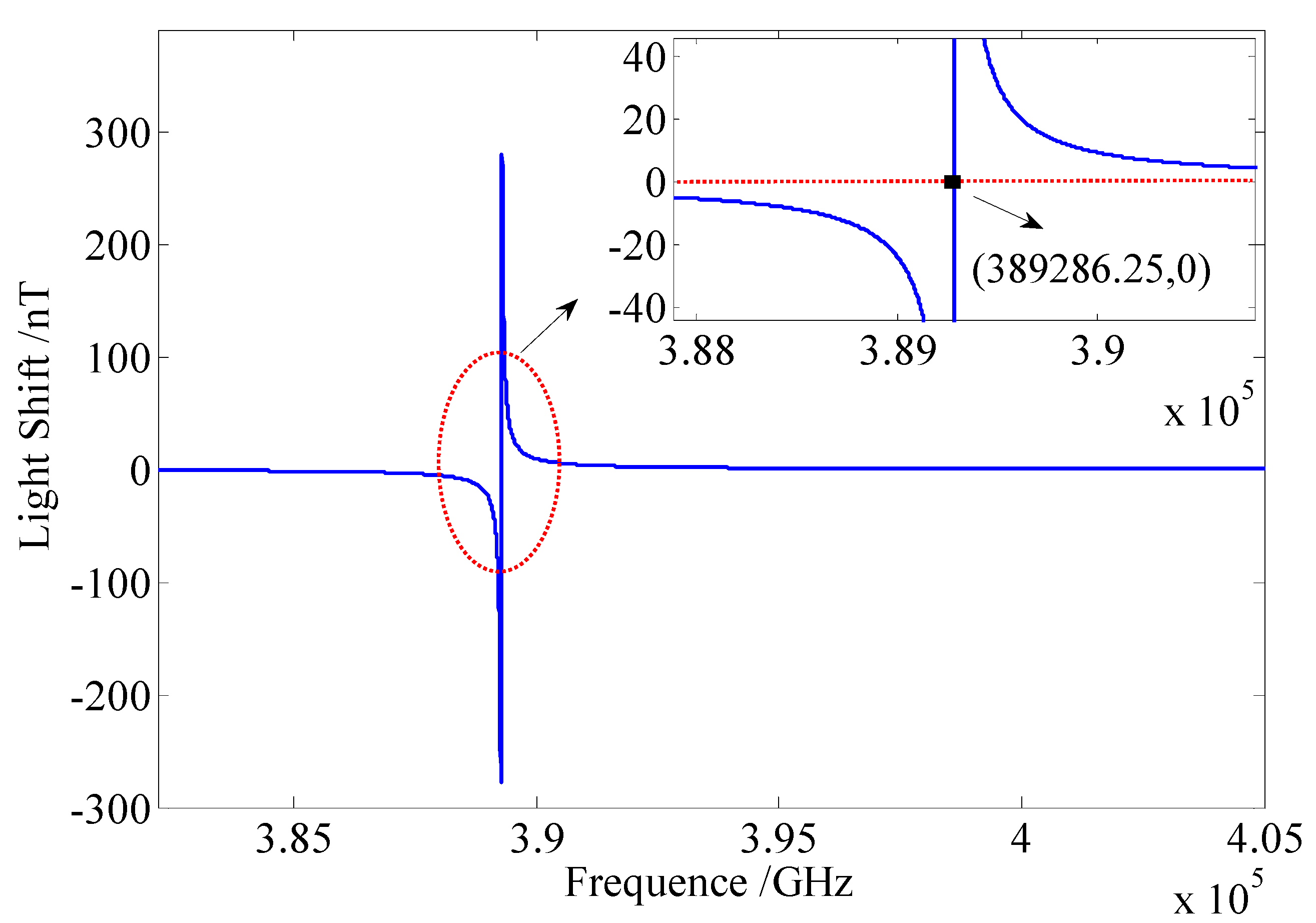 Simulation of the relation between the light shift and the frequency of the pump laser. The power of the pump laser is 100 mW, and the frequency at the resonant peak of potassium atom is 389,286.25 GHz.