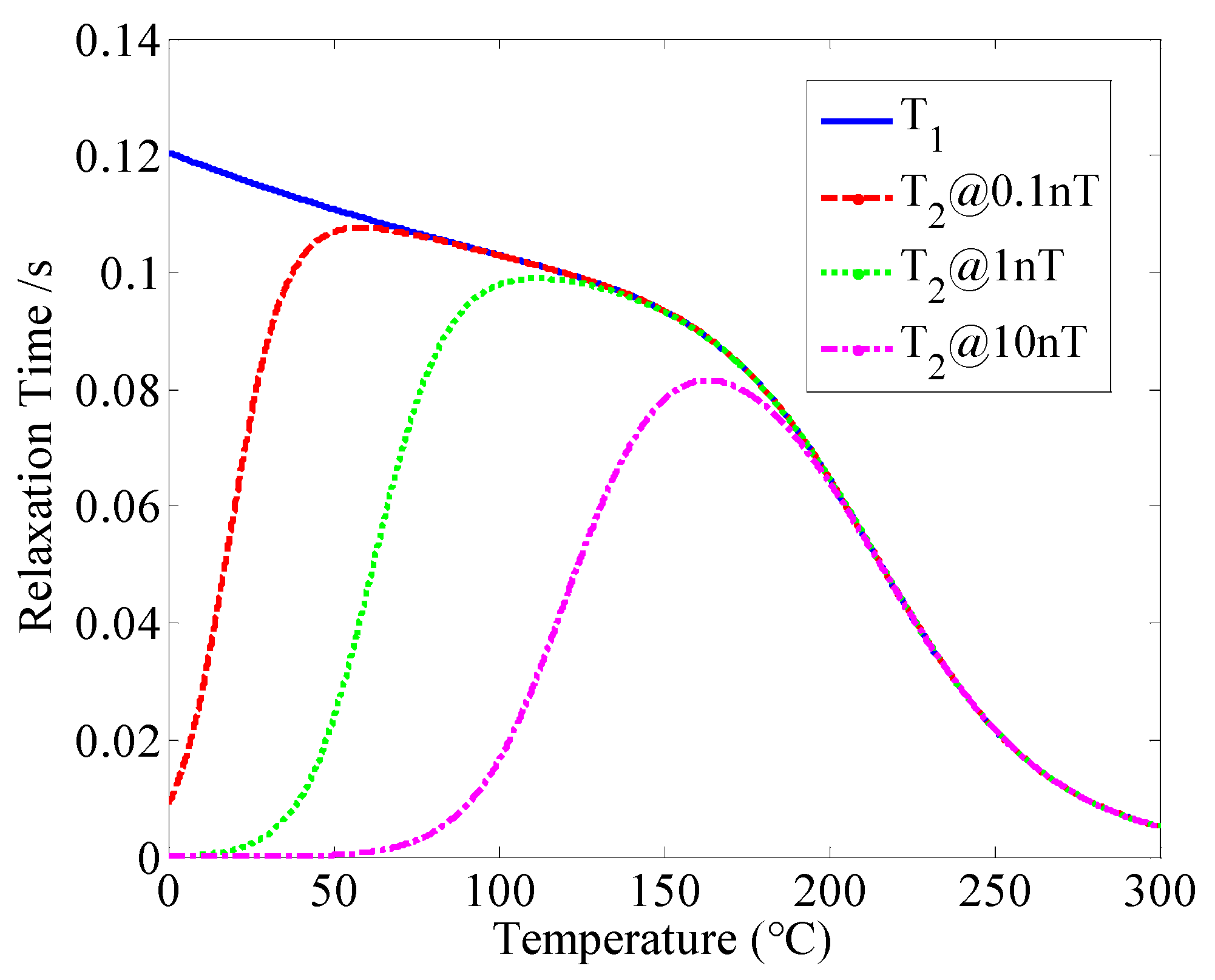 where is the spin-exchange broadening factor, is the spin-exchange relaxation rate, is the relaxation due to the magnetic field gradient across the vapor cell, which is a tiny amount that is neglected due to the cell placement in the center of a uniform magnetic field, I is the nuclear spin quantum number, T is the temperature in cell, Ak = 4.402 and Bk = 4453 are the parameters, σspecies is the effective collisional cross-section, KB is the Boltzmann constant, M is the reduced mass, Pspecies is the gas pressure, ve is the relative thermal velocity between the alkali metals atoms, and is the spin exchange collision cross section. One of the most striking features of the electron spin in the SERF regime is that the spin exchange is suppressed. In other words, if the spin-exchange relaxation rate Rse is suppressed, the transverse relaxation time T2 will be approximately equal to the longitudinal relaxation time T1, and the atomic spin SERF regime will be realized. According to Equations (10)–(14), we know that both the transverse relaxation time T1 and the longitudinal relaxation time T2 are related to the temperature T. The simulation of the atomic magnetometer realizing the SERF regime is shown in Figure 5.