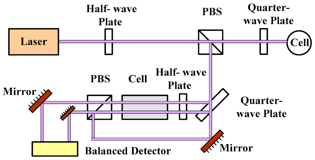 The arrangement of the SERF atomic spin magnetometer is shown in Figure 2. A cubic glass cell (25 mm length) contains a droplet of K atoms, 2 atm of 4He to reduce the wall collision relaxation, and 30 Torr of N2 to quench the alkali-metal excited state. The cell is heated to more than one hundred of degrees by a non-magnetic electric heating device to obtain a high atomic number density. The circularly-polarized beam is tuned to approximately 770.108 nm. The center wavelength of the linearly-polarized probe beam is about 766.2 nm. A Faraday modulator is placed in the probe optical path. Optical rotation can be detected by this linearly-polarized probe beam.