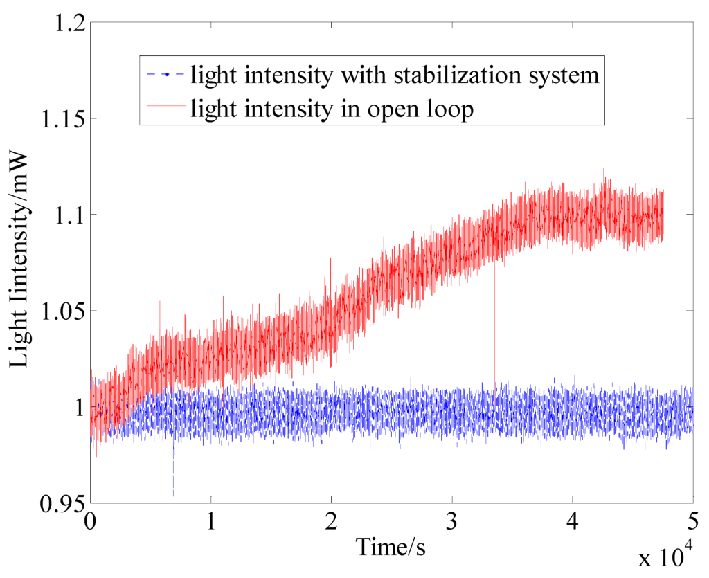 If the pumping power fluctuates from 95 mW to 100 mW, the polarization will change from 65% to 66%. It is very important to stabilize the pumping power, especially in the low pumping power condition. According to Equation (9) and Figure 4, we can know that if the frequency fluctuation transforms to 472 GHz, the light shift changes about 4 nT. However, these two noises can be suppressed by employing the frequency and the power stabilization systems, as shown in Figure 7 and Figure 8, respectively.