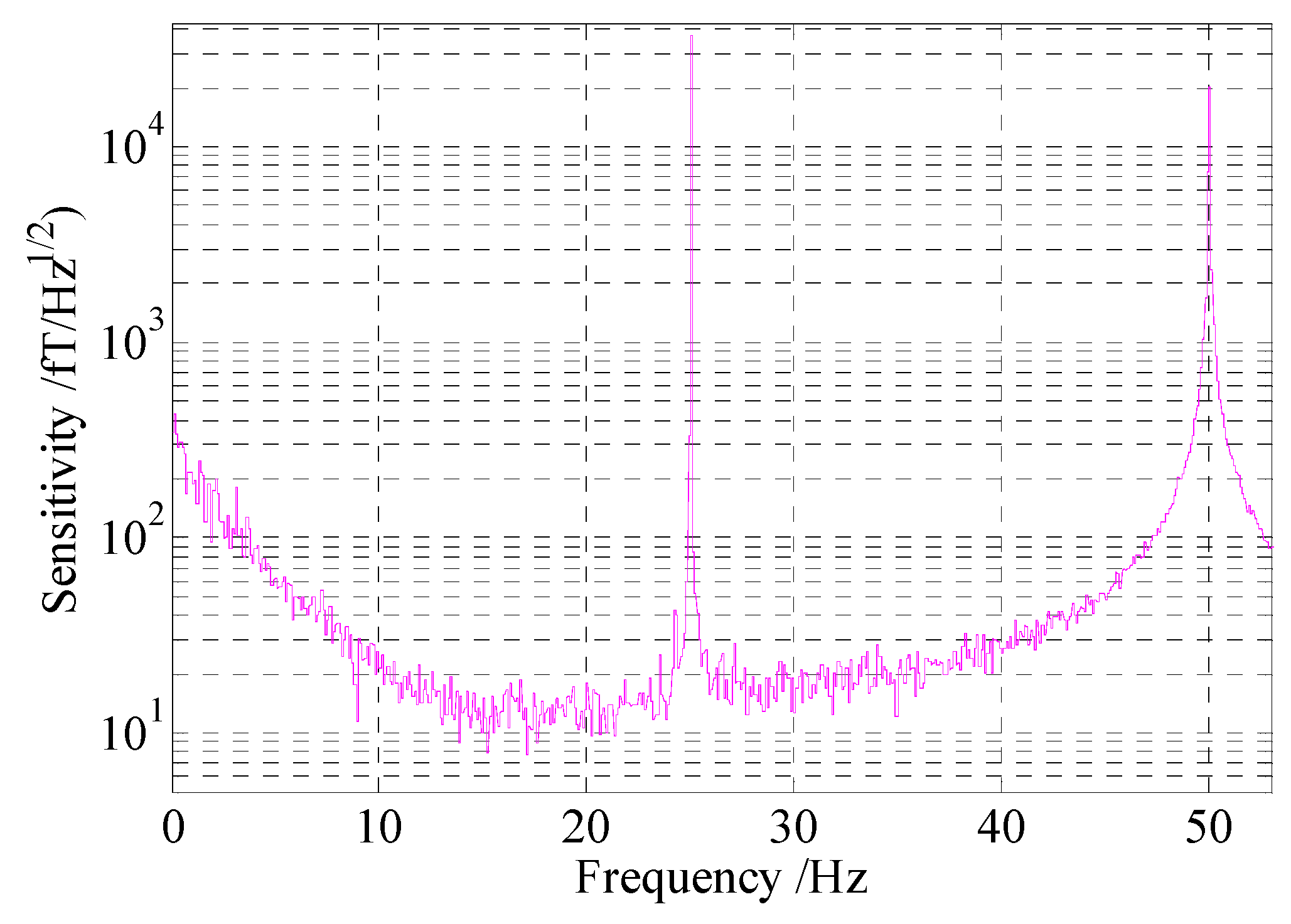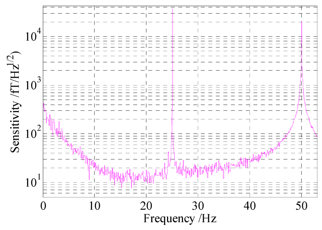The experimental apparatus is described as Figure 2. In order to analyze the effects of the noises on the sensitivity, relevant experiments were implemented. A 22.5 pT calibration signal at 25 Hz was applied to the y direction in these experiments. After FFT, the output signals were processed by divided a normalized frequency-response function with a fit to A/( + )1/2, where A is the coefficient, f0 is the frequency, and Bbandwidth is the bandwidth [17]. By analyzing the signal to noise ratio, the sensitivities of the magnetometer under the different situations were achieved. The experimental results are shown in Figure 10. Figure 10a indicates that under the condition of the residual magnetic field coarse compensation, the sensitivity was about 20 fT/Hz1/2. However, when the residual magnetic field is compensated accurately, the sensitivity can be promoted efficiently, as shown by the dotted line in Figure 10a.
