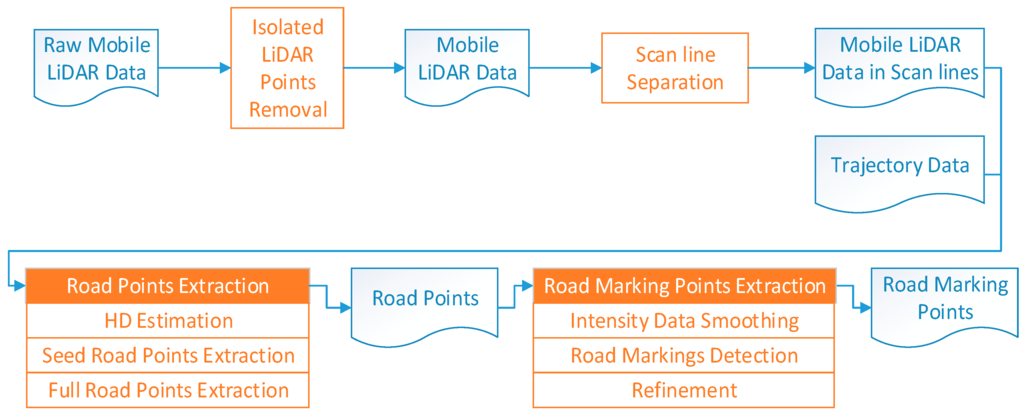 This paper is structured as follows: Section 2 introduces our preprocessing methods including the method to remove isolated LiDAR points in the air from the raw LiDAR data and the approach to organize LiDAR point clouds into scan lines. In Section 3, the method to extract road points is addressed in detail and Section 4 focuses on the algorithms of road marking points extraction from road points and FRMPs elimination. Experiments, results and discussion are presented in Section 5. Finally, Conclusions are presented in Section 6.