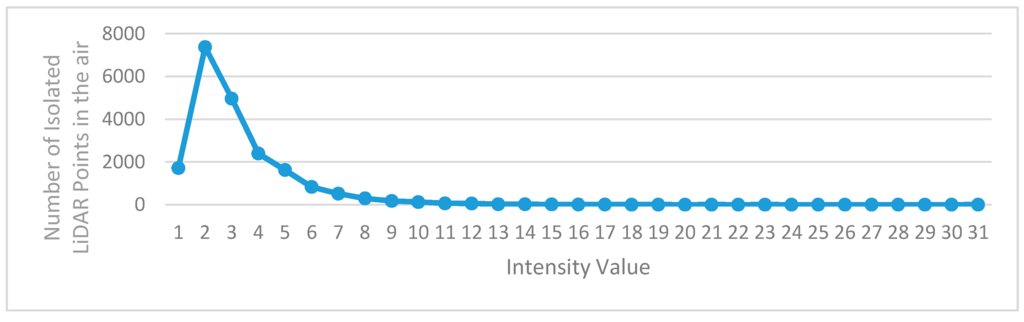 The isolated LiDAR points in the air occurring in the scanned point clouds affect the algorithms used to extract object information from point clouds. Actions should be taken to remove or reduce the isolated LiDAR points in the air before any subsequent operations. There are many causes for the isolated LiDAR points in the air, and the dust in the air is a case in point. No matter what the causes are, the intensity values of the isolated LiDAR points in the air are low. Figure 2 shows the intensity histogram of some isolated LiDAR points manually labeled from a dataset, which indicates that the intensity values of almost all isolated LiDAR points in the air are less than 10. This may be because that the isolated LiDAR points in the air are reflected by objects with very small diameter present in the air. Due to the small diameter, a very small part of the laser energy is reflected, leading to the observed small intensity values. Another characteristic of the isolated LiDAR points in the air is that their scanning distance (the distance from object to laser scanner) is obviously shorter than that of the previous scanned point and the next scanned point, as illustrated in Figure 3.