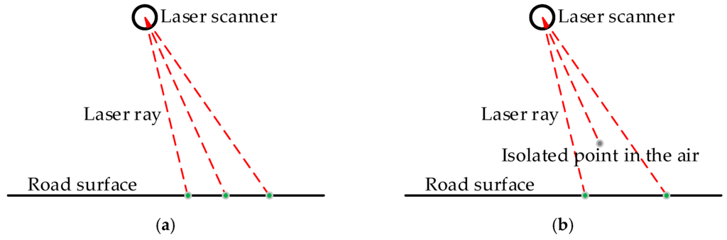 Three consecutive object points scanned by MLS: (a) three points are all road points; (b) one point is isolated point in the air with scanning distance obviously shorter than that of the previous point and the next point.