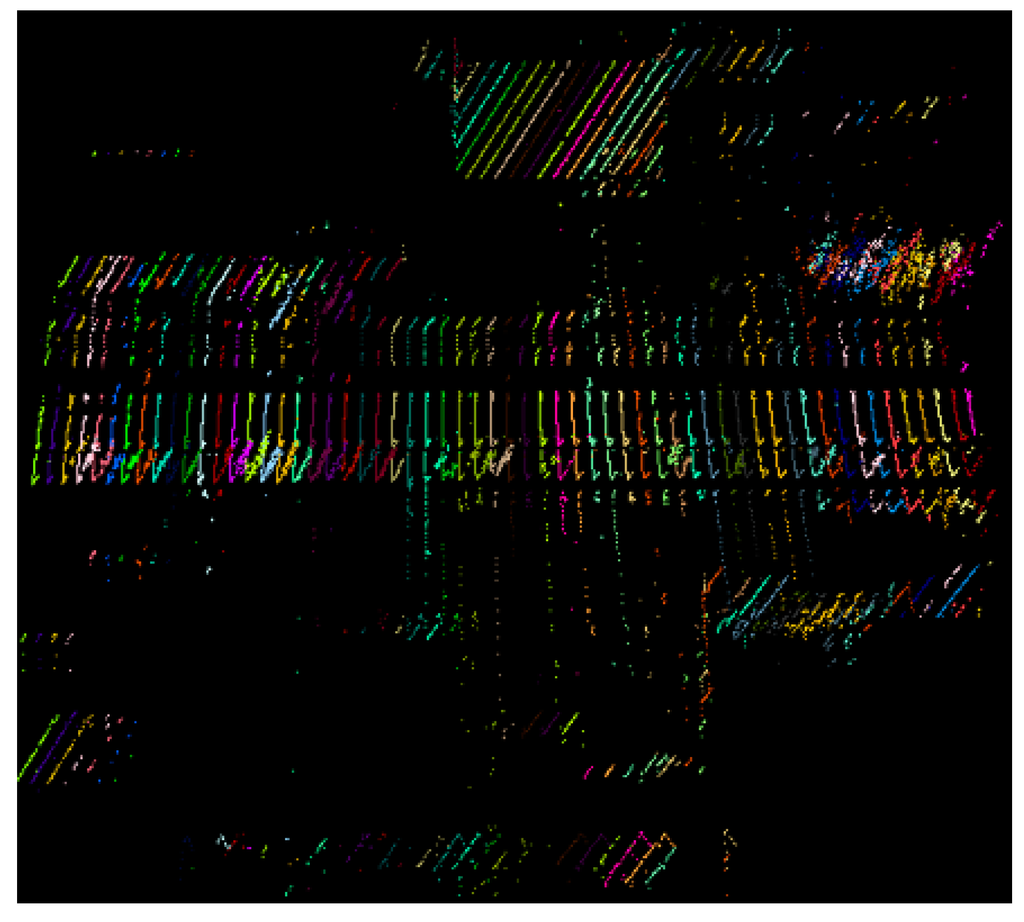 The scanning angle of a point p can be acquired from the raw LiDAR data or computed from its coordinates in Scanner Owned Coordinate System (SOCS). The scanning angles of points in each scan line increase consecutively from the minimum to the maximum in the Field Of View (FOV). For a mobile LiDAR with FOV of 360 degrees, the scanning angles of points in a scan line range from 0 to 360. The whole mobile LiDAR points can be separated into different scan lines according to the scanning angle. Figure 4 illustrates a small part of point clouds separated into scan lines. In order to show the scan lines more clearly, one scan line is selected in every 50 scan lines.