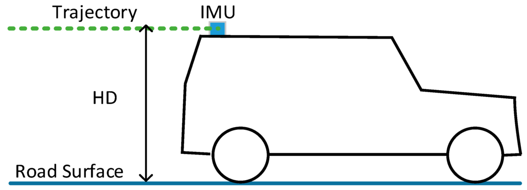 The Position and Orientation System (POS) is rigidly fixed on the platform of a mobile LiDAR system. The points under the trajectory data are certainly road points. The Height Difference (HD) between trajectory and road surface (Figure 5) can be estimated based on the trajectory data and scanned mobile LiDAR point clouds. This HD can be used to help extract seed road points from scan line data effectively. After seed road points are extracted, full road points are extracted by moving least squares line fitting.