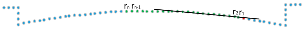 Fitting a line conform to the local part of the road surface. The green points are already identified road points and the red point is the point need to be determined whether it is a road point or not.
