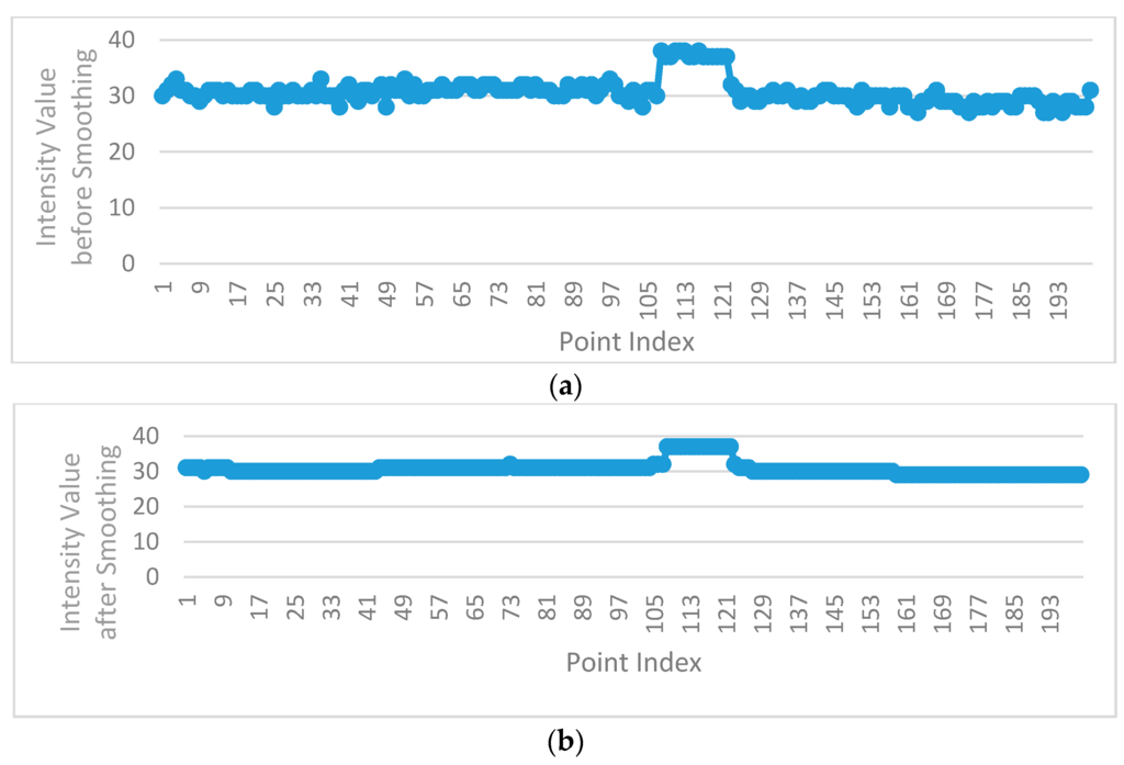 In order to preserve the intensity value of road marking edge points successfully, the window size should be smaller than the point number of road markings in the scan line. Because of different scanning distances, the distribution of mobile LiDAR points is non-uniform, and the point number of road markings varies in different scanning distances even when the width of the road markings are the same, so the window size of the median filter should be dynamically changed according to the point resolution. According to the standard for road markings [36], the minimum width of road markings in China is 0.2 m; thus in this paper, the window size of the median filter is dynamically determined by the minimum width and the point resolution. Figure 8b illustrates the intensity values after filtering by dynamic window median filter, with the intensity values of asphalt road surface points effectively smoothed and the intensity value of road marking edge point successfully preserved.