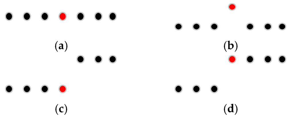 Median filter with window size of 7 and the points colored in red are points at the center of the window. (a) The intensity value of the center point is normal and will be kept; (b) The intensity value of the center point is obviously greater than other points and will be replaced; (c,d) The center point is at the edge of road marking and its intensity value will be kept.