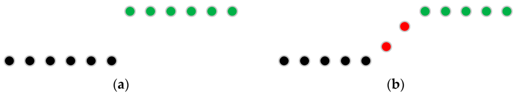Steep edge and smooth edge between asphalt road points and road marking points: (a) Steep edge; (b) Smooth edge. The black points are low intensity points, the green points are high intensity points and the red points are transition points between high intensity points and low intensity points.