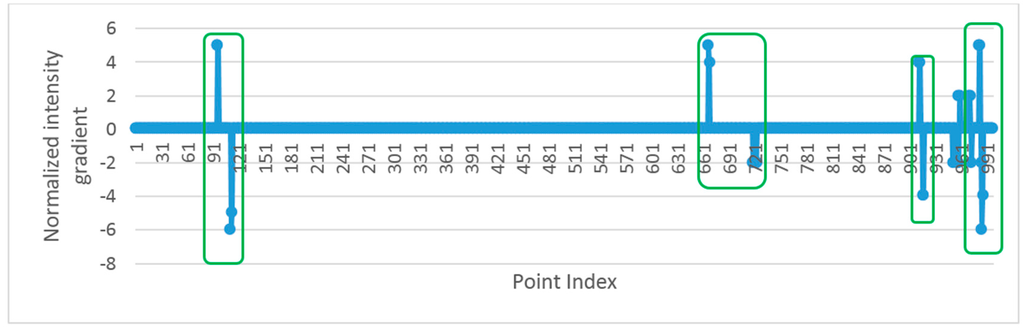 In Equation (8), Gi is the gradient of ith point, and Ii and Ii−k are the intensity values of ith and (i − k)th point. Since the intensity values change smoothly after filtering, the absolute value of Gi equals to zero or one at non-edge points and the absolute value of Gi is greater than 1 at edge points. In order to detect edge points more conveniently, the gradients are further normalized to: