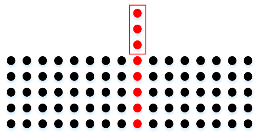 The intensity values of road points in a scan line can be classified into two types: (1) the intensity values of road marking points; (2) the intensity values of asphalt road surface points. The intensity values of asphalt road surface points in a scan line (except the edges between road marking points and asphalt road points) should theoretically be the same or change smoothly, but in fact, the intensity values of adjacent asphalt road points in a scan line may vary greatly (Figure 8a). In order to smooth the intensity data of points in a scan line, median filter is used, which can not only smooth the intensity data of asphalt road surface points but also can preserve the intensity value of road marking edge point. Figure 9 shows four situations in filtering process by median filter with window size of 7. In Figure 9a,b, the points inside the window are all asphalt road points or all road marking points. In Figure 9a, the intensity value of the point at the center of the window is normal and will be kept. In Figure 9b, the intensity value of the point at the center of the window is obviously greater than that of others in the window and will be replaced by the median value of intensity values inside the window. In Figure 9c,d, the center point of the window is at the edge of road marking and the intensity value of the center point will be preserved after filtering since the window size is odd.