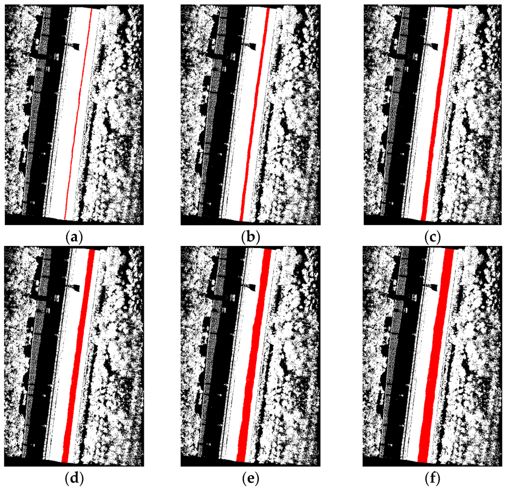 Seed road points extracted with different height difference threshold: (a) ρhd = 0.01 m; (b) ρhd = 0.02 m; (c) ρhd = 0.03 m; (d) ρhd = 0.04 m; (e) ρhd = 0.05 m; (f) ρhd = 0.06 m.
