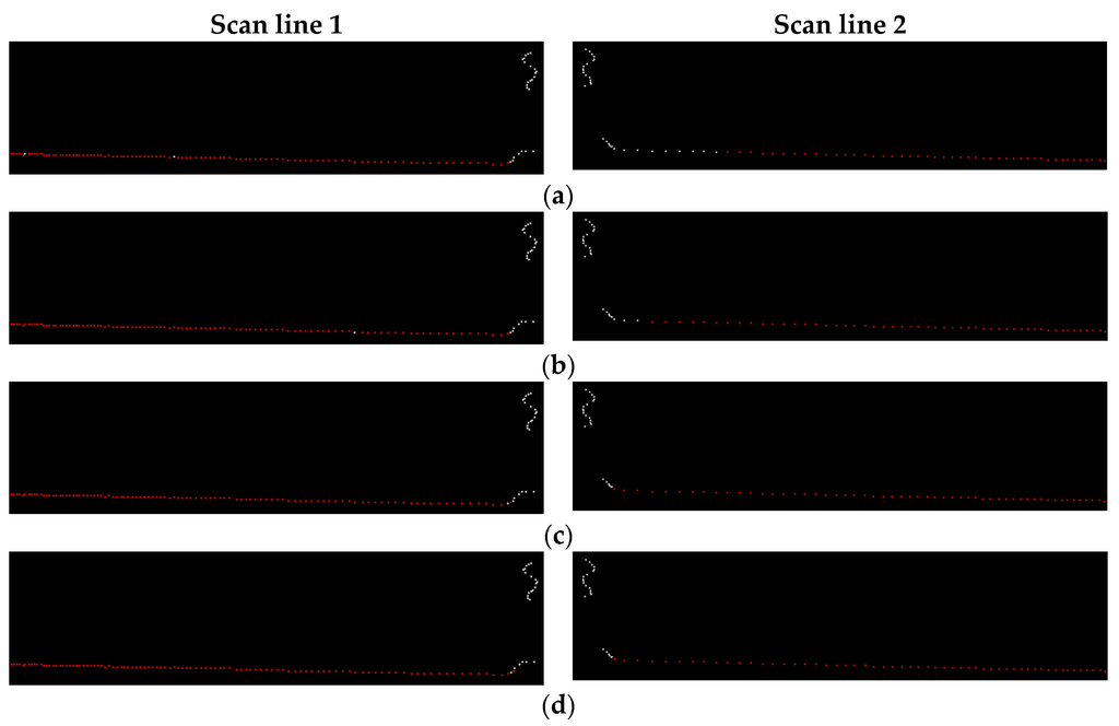 Road points (colored in red) extracted from two scan lines with different distance threshold: (a) ρd = 0.01 m; (b) ρd = 0.02 m; (c) ρd = 0.03 m; (d) ρd = 0.04 m.