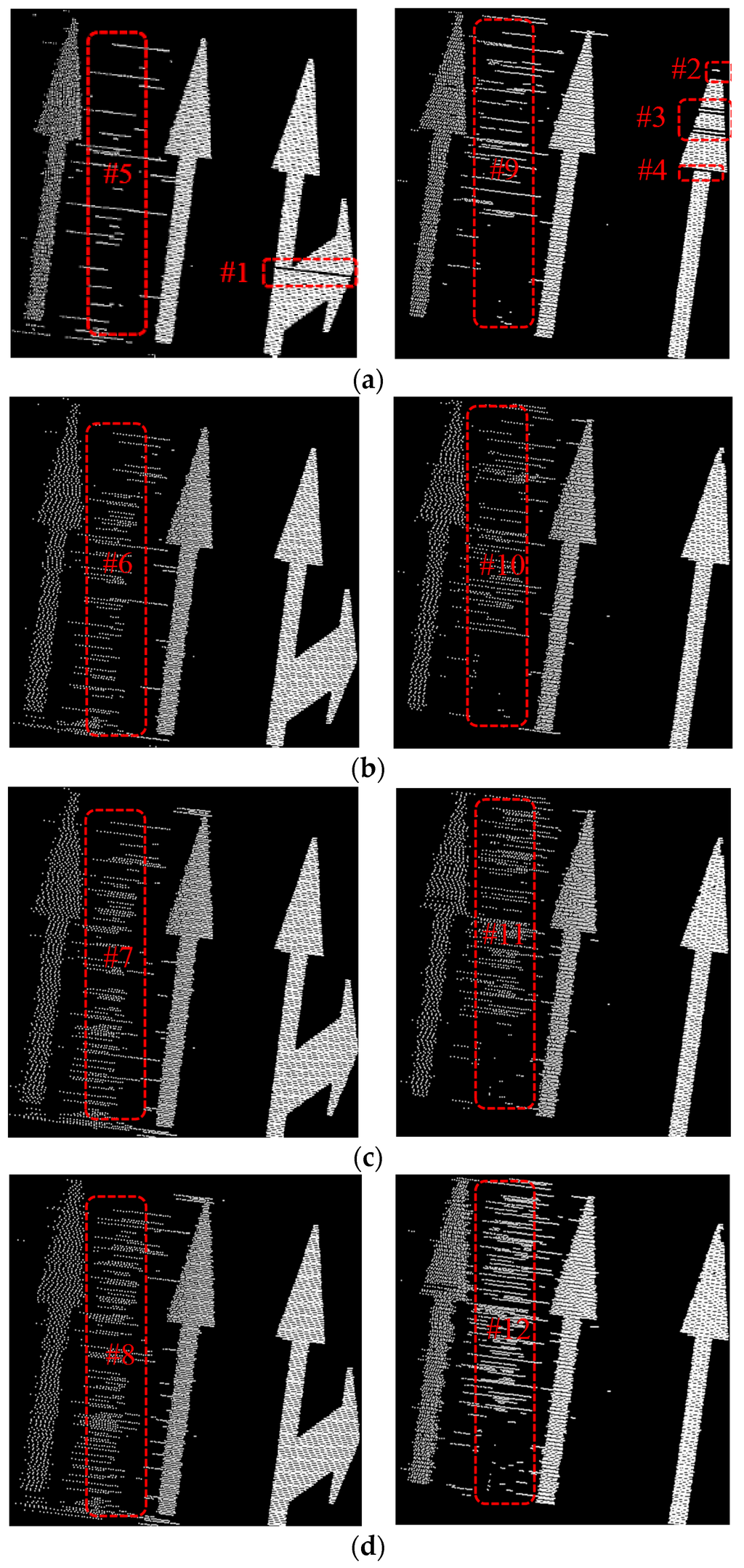 Ideally, k with value 2 is enough to extract road marking points in EDEC, but some road marking segments may be missed because of the existence of smooth edges (some road marking segments are missed in #1, #2, #3 and #4 in Figure 17). With bigger k value, fewer road marking segments will be missed (none road marking segment is missed when k is set to 3, 4, and 5 in b–d), but more FRMPs appear in the result (it can be seen from #5, #6, #7, #8 and #9, #10, #11, #12 in Figure 17 where more FRMPs appear with the increase of k value). To extract road marking points more completely and to minimize the number of FRMPs, k is set to 3 in the experiments.