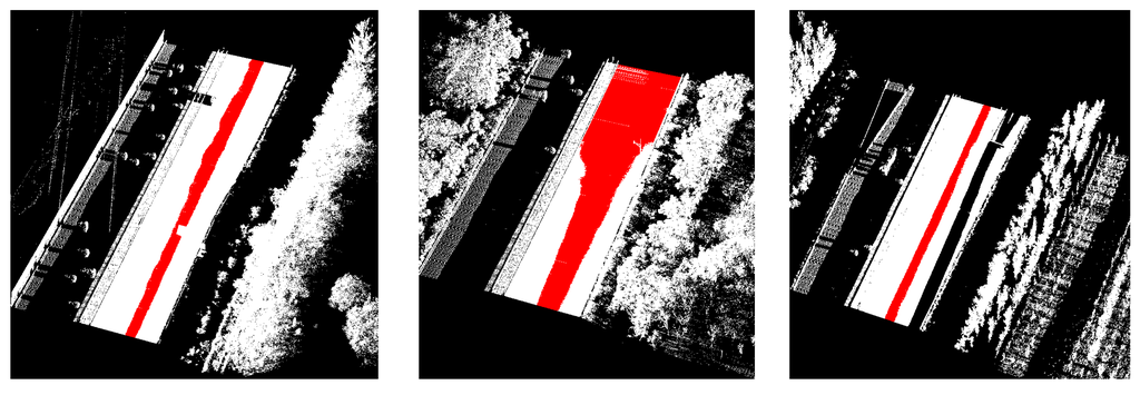 The height difference threshold ρhd will affect the point number of seed road points extracted. A smaller ρhd will result in fewer seed road points and bigger ρhd will result in more seed road points. We tested a set of parameter configurations on seed road points extraction and the testing results are shown in Figure 15. As seen from the seed road points extraction results, all configurations extract seed road points quite well, in which the bigger ρhd is, the more seed road points are extracted. In order to ensure that enough seed road points are extracted and avoid non-road points being mistakenly extracted as seed road points, we set ρhd to 0.03 m in our experiments.