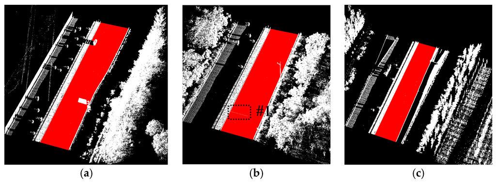 Compared with the manually labeled reference data, the road markings extracted by Yongtao’s method miss road marking points in #7, #8, #9, #11, #12 and #14 in Figure 21 and many FRMPs exist in #10 and #13 in Figure 21. #7 and #9 are missed because the points are divided into blocks in Yongtao’s method and the intensity of these points are much lower than that of other road markings belong to the same block, especially #7 which corresponds to #3 in Figure 19. We can clearly identify that the intensity values of points in #3 in Figure 19 are lower than the nearby road markings. The right side of data sample A and data sample B are emergency lanes where vehicles are not allowed to run on except during an emergency. Similarly, vehicles are not allowed to run on exit lines on the right side of data sample C, so the road surface on the right side is less worn, leading to high intensity values of the points scanned on these areas. Due to the high intensity values of points scanned on the right side, many points are mistakenly extracted as road marking points (#10 and #13 in Figure 21) and some of the road markings belong to the same block are missed (#11, #12, #14 in Figure 21). Our method only misses a small area in #15 in Figure 22 which corresponds to #3 in Figure 19. Even after segment and dimensionality refinement, some FRMPs still exist in our result (#16, #17, #18, #19, #20 and #21 in Figure 22).