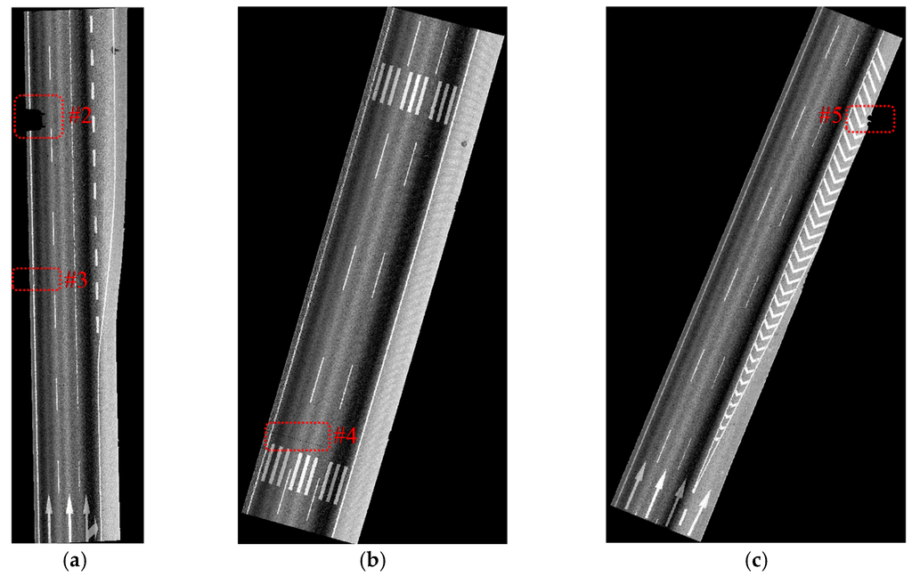 For convenience, three typical data samples (data sample A, data sample B and data sample C as illustrated in Figure 14) are selected as test data from the whole dataset. Data sample A is about 100 m long and contains about 2.8 million points. Arrow shape and rectangle road markings are included in data sample A. Data sample B is about 70 m long and contains about 2.2 million points. Zebra crossings and other rectangle road markings are included in data sample B. Data sample C is about 100 m long and contains about 2.8 million points. Arrow shape road markings, rectangle road markings and exit signs are included in data sample C.