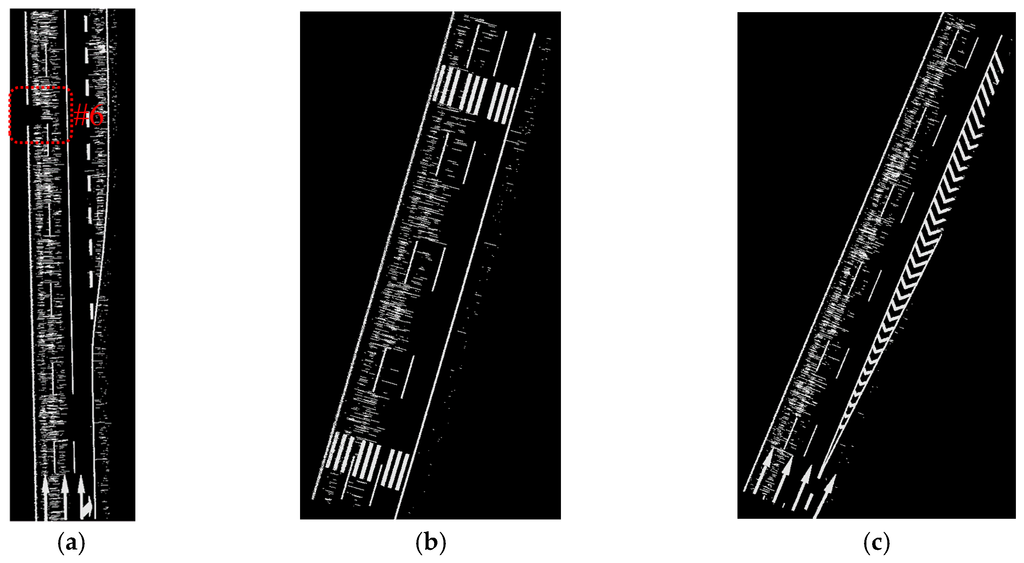 Road markings extracted by Yongtao’s method: (a) from data sample A; (b) from data sample B; (c) from data sample C.