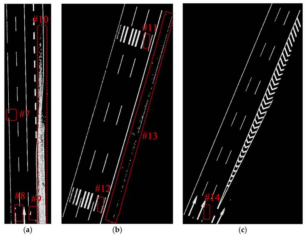 As seen from Figure 20, all road markings appeared in Figure 19 can be identified in Figure 20. Besides the road markings appear in Figure 19, many FRMPs are also mistakenly extracted as road marking points in Figure 20. There is no points in #6 in Figure 20 as a result of car occlusion in data acquisition.