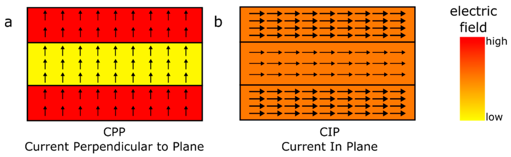 Simple double layer stacks in CPP (a) and CIP (b) configuration. CPP leads to a homogeneous current density (arrows) while the electric field is inhomogeneous, where CIP exhibits a homogenous electric field and an inhomogeneous current density.