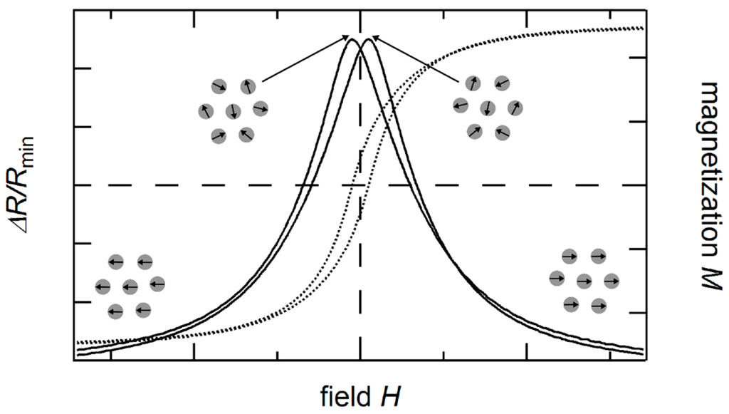 Schematic illustration of the granular GMR (solid line) in dependence of the applied field and sample magnetization (dotted line). The granular GMR exhibits the highest resistance at the coercive field as the magnetic moments of the particles are randomly oriented there. The dashed lines are a guide to the eye.