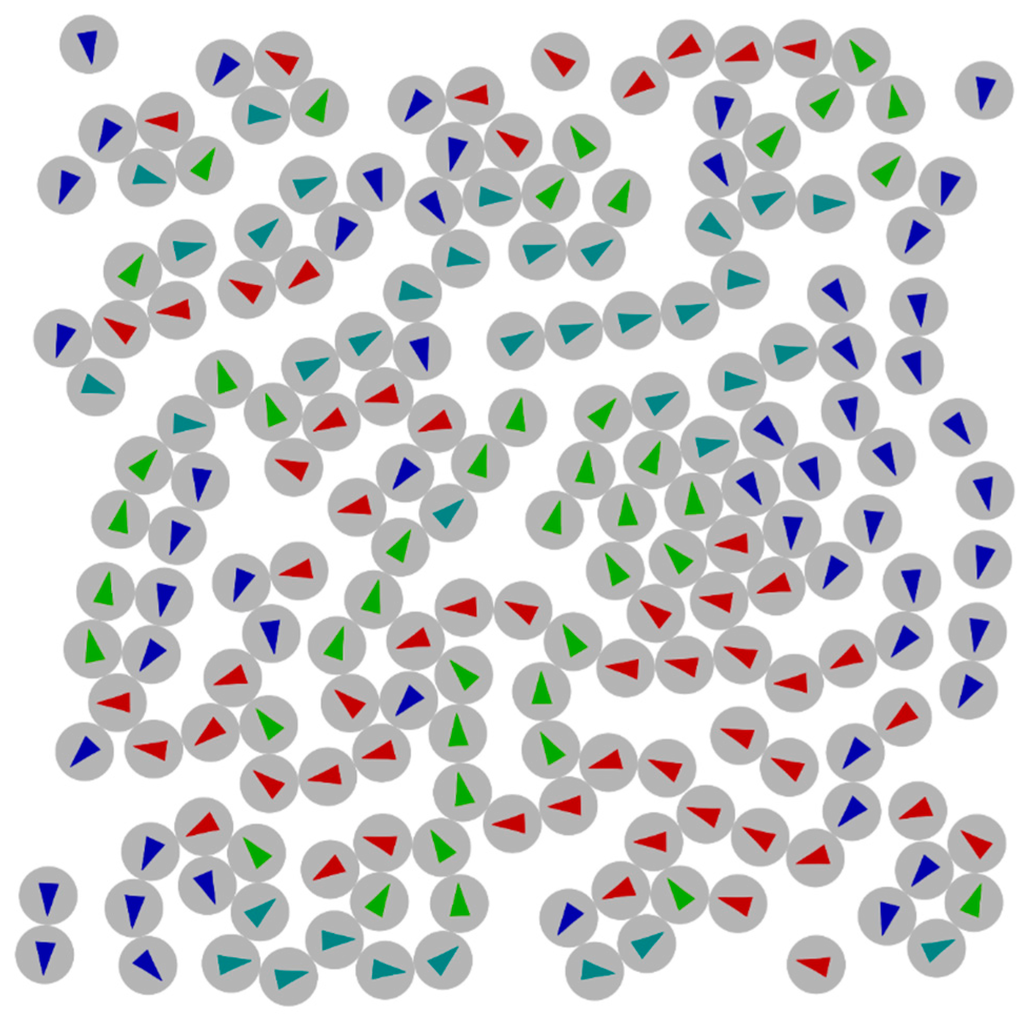 These models all use some kind of averaging the magnetic moments of the systems, which seems to work fine as long as the concentration of grains is low enough. As soon as the distance between grains becomes small their dipole interactions lead to the assembly of ferromagnetic or antiferromagnetic domains, or more complex ordering. Teich et al. [] used micromagnetic simulations to calculate magnetic ground states for magnetic particle assemblies, an example may be seen in Figure 4. These areas of magnetic ordering are likely to have influence on the electric conductivity of the system. To the best of our knowledge, there are to this point no studies on the influence of this. Systematic addition of differently shaped particles or the removal of particles could lead to increased GMR and tailoring of a granular system to specific needs.