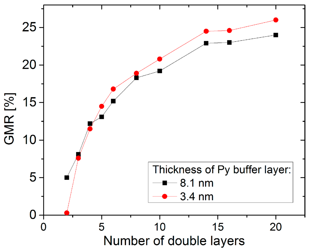 The first GMR multilayer stack was prepared in 1988 by Fert et al. []. They examined the characteristics of a {Fe/Cr}N system to explore the origin of the GMR effect. Driven by possible applications as sensors in automotive and read-head industry, numerous studies have been performed to improve the GMR characteristic since then [,,]. A main goal was the improvement of layer materials and thicknesses in order to identify the optimum microstructural and magnetic features which enhances the GMR effect amplitudes in the multilayer systems and therefore, achieve higher sensitivities for sensor applications. Interface roughness is one of these microstructural characteristics that determines the GMR potential and has been intensively studied (for a review of numerous interface studies performed on Fe/Cr and Co/Cu multilayers see []). Furthermore the grain size has to be considered [,]. It has been found that neither the crystallite size nor the interface roughness alone determine the GMR of a multilayer, but the combination of both aspects. A combination of large grains with moderate interface roughness has been reported to be an ideal candidate for good GMR [,,]. The interface roughness can be influenced employing a suitable buffer layer, whereas an appropriate buffer layer thickness has to be chosen depending on the materials used and the number of double layers. In Figure 5 the influence of the number of Co1.1nm/Cu2.0nm double layers on the GMR amplitude has been shown for two different Py buffer layer thicknesses. For small numbers of bilayers an increasing thickness of the buffer layer is favorable to obtain a larger GMR amplitude due to the enhancement of the antiferromagnetic coupling in the undermost bilayers.