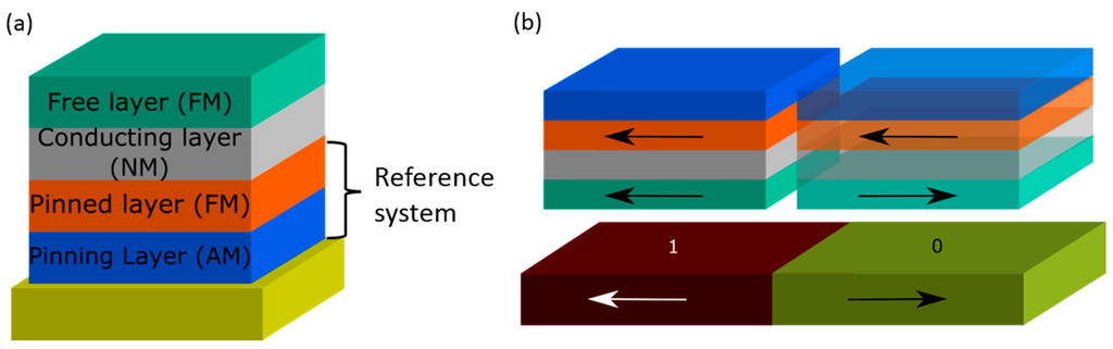 (a) Schematic setup of the stack configuration of a GMR spin-valve sensor; (b) Conceptual operation of a GMR read head: when a spin-valve sensor moves across an interfaces between two bits with magnetic moments oriented in opposite direction (marked by “1” and “0”), the magnetic moment of the free layer is reoriented according to the orientation of the next bit.