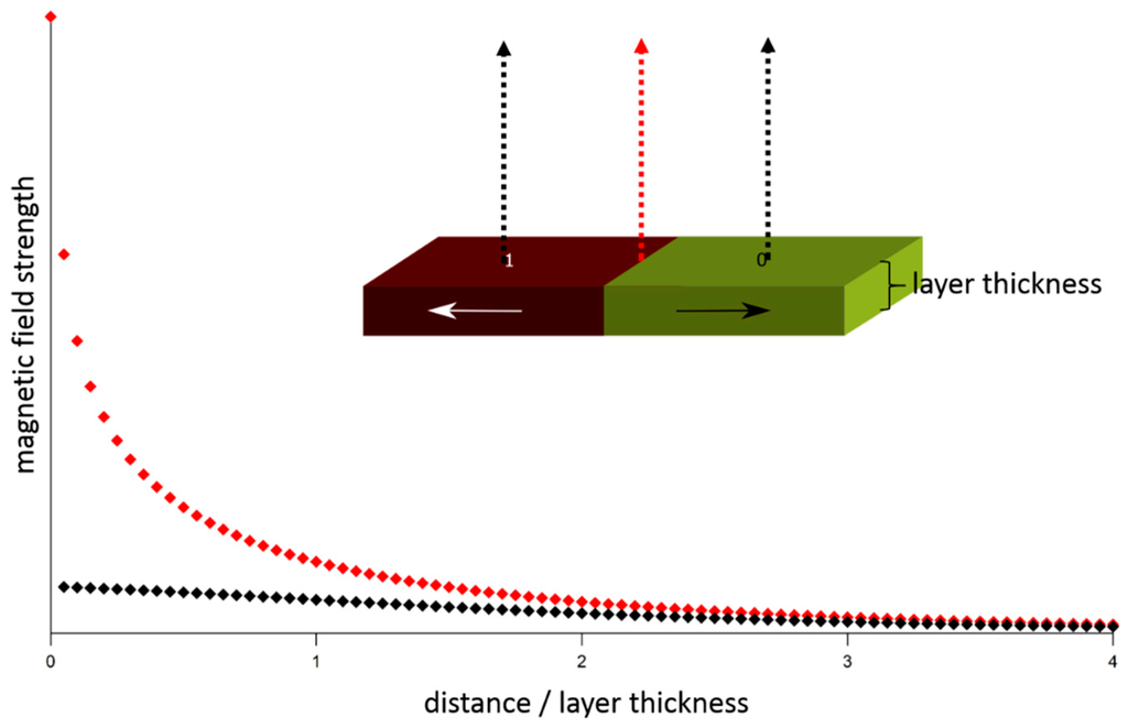 Magnetic stray field strength as a function of the distance from the layer surface, calculated for a bit structure with opposing magnetic moments as shown in the sketch. The arrows in the sketch mark the positions of the stray field calculations (black curve: middle of bits, red curve: interface between bits).