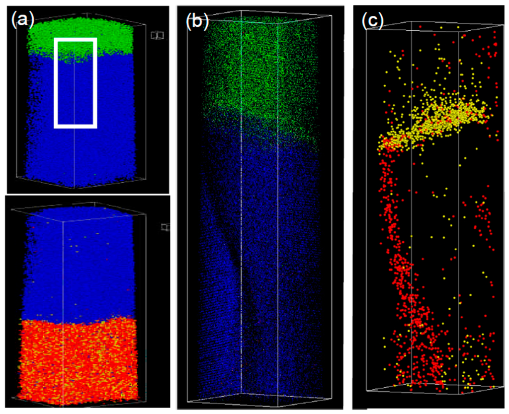 The optimum temperature depends on the choice of layer materials, thicknesses, the possibly used buffer layer and substrate materials. Within the framework of this review the focus is on Co/Cu based layer systems. For example, if the thickness of the individual layers has been optimized for the first antiferromagnetic coupling (AFC) maximum an optimum temperature of about 150 °C has been reported [], while for systems optimized for the second AFC maximum a critical temperature of about 375 °C has been observed []. For annealing processes above the critical temperature a breakdown of the GMR amplitude is observed. Different reasons for this deterioration of GMR in Co/Cu multilayers have been discussed in literature: Observations of Co bridges through Cu layers have been reported by means of field ion microscopy and transmission electron microscopy (TEM) [,]. These defects of the layered structure were observed in systems with high interface roughnesses even in the as prepared state leading to a strong ferromagnetic coupling of the adjacent Co layers. TEM studies of Co/Cu multilayer samples reported by Rätzke et al. show the transport of Cu into the Co layers along grain boundaries []. An alternative method for the observation of the mechanism of GMR deterioration is the atom probe tomography (APT) [,,]. In Figure 8a a 3D reconstruction of a Py25nm/Cu20nm/Co10nm trilayer obtained by APT is shown. After an annealing at 350 °C for 30 min. (Figure 8b,c) it can be clearly seen that Ni atoms from the Py buffer layer segregate along grain boundaries into the Cu layer (red dots in Figure 8c). This segregation path forms the initial stage of pinhole formation and causes ferromagnetic bridges through the non-magnetic coupling layer, causing a decrease of GMR effect [].