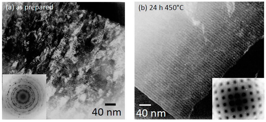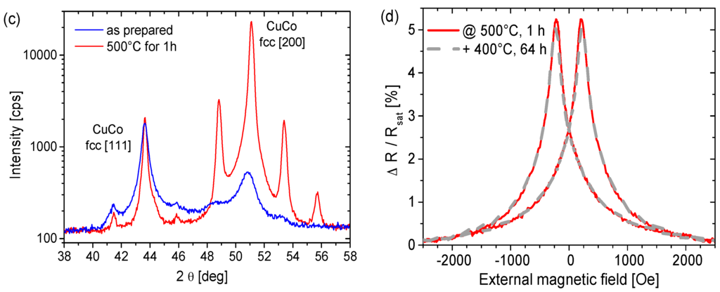 A concept how to avoid these effects and to improve the temperature stability of Cu/Co multilayer systems has been reported by Heitmann et al. []: For a [Py3nm/Cu6nm/Co3nm/Cu6nm]20 multilayer system it has been shown that an annealing at 500 °C for 24 h triggered a complete recrystallization of the sample from a dominating polycrystalline [111] texture in the as prepared state to a [100] quasi single crystalline state after annealing. The most striking aspect of the microstructural evolution is the preservation of the layered structure (compare Figure 9a,b). This crystallographic reorientation is triggered by the minimization of lattice mismatch elastic energy: Under equal strain the elastic energy in a [111] oriented CoCu material is higher than the energy in a [100] structure due to the elastic properties of the materials. By recrystallization in a [100] structure a reduction of elastic energy in the order of 0.8 eV per interface atom is achieved [,]. But it is important to note, that a prior annealing of the sample at moderate temperatures which has led to a considerable reduction of dislocations in the course of recovery, while the temperature was not high enough to activate recrystallization process, a further temperature increase not necessarily initiate a recrystallization any more. This is caused by the decrease of the driving force []. Therefore, recrystallization can only occur after heating up the sample directly to sufficient temperatures. The GMR measurements, given in Figure 9d, for the recrystallized Co/Cu multilayer show that the GMR effect remains stable at further heat treatment below the initial annealing temperature for 64 h.