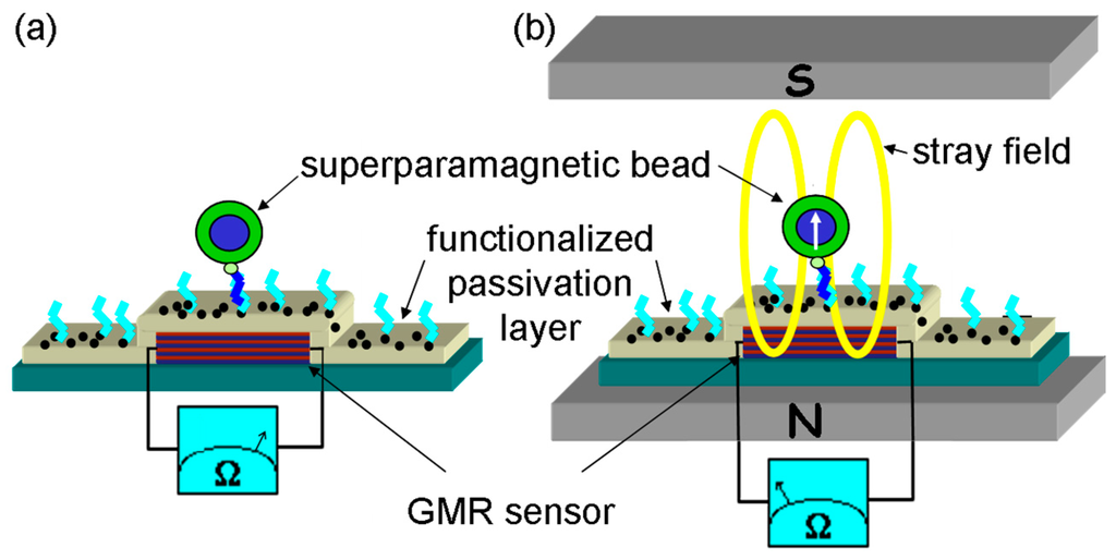 Due to the ability of GMR systems to sense even small magnetic fields, the potential of GMR sensors for the detection of magnetic beads was realized and led to another growing technological field, the development of magnetic biosensors for life science applications. Only ten years after the discovery of GMR the first magnetic biosensor was presented by Baselt et al. [].