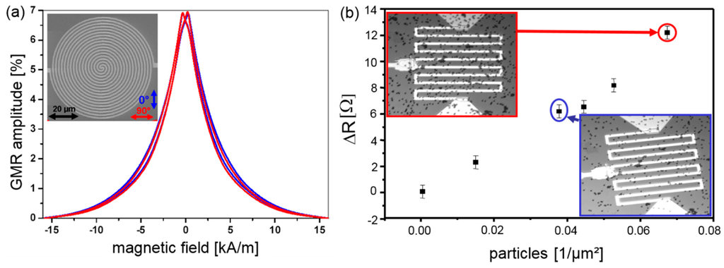 The superparamagnetic nature of the beads allows to switch on their magnetic stray field by a homogeneous external magnetic field oriented perpendicular to the sensor surface, see Figure 10b. Hence, the stray field components of the magnetic markers within the sensitive sensor area can be detected by a drop in the electrical resistance of the GMR sensor. For an optimum bead detection, GMR sensors with isotropic signals and high sensitivities are needed. In [,] the use of a Py1.6nm [Cu1.9nm/Py1.6nm]10/Ta3nm multilayer stack for the detection of magnetic beads was reported. To prevent any influences of magnetic anisotropies of the used materials on the GMR characteristic a spiral-shaped structure has been chosen. In Figure 11a the nearly isotropic GMR characteristic for two perpendicular oriented in-plane magnetic fields are shown. For this type of sensor a sensitivity of 0.6% per kA/m for in plane magnetic fields has been achieved, resulting in a detection limit of a DNA concentration of only 16 pg/µL, which is superior to standard fluorescence detection methods []. The dependence of the resistance change ΔR on the particle coverage of the sensor surface is shown in Figure 11b. A nearly linear behavior of the output signal is observed for low particle concentrations [].